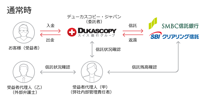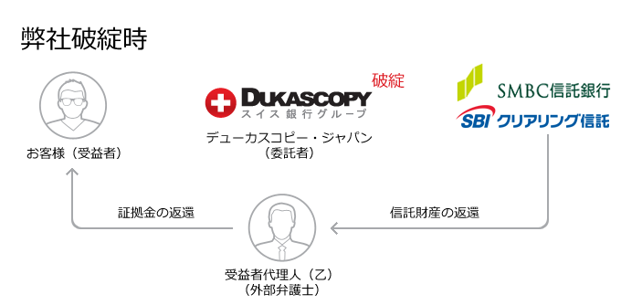 弊社は、受益者代理人を弊社の内部管理責任者、受益者代理人を外部の弁護士として、この2名をお客様(受益者)の利益を代表する「受益者代理人」に選定します。弊社が契約する信託先は、弊社から信託された資金の管理のみを行い、弊社および受益者代理人の監督、選任の責任は負いません。万一、弊社に破綻等の事態が生じた場合は、受益者代理人を通し信託保全されている範囲でお客様の資産が返還されます。いかなる場合も、信託先から直接お客様へ資産が返還される事はありません。またお客様より資産返還を信託先へ直接依頼することは出来ません。