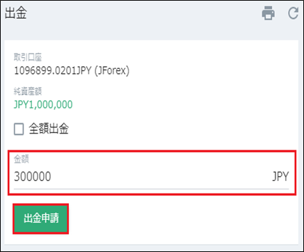 「出金」画面において、取引口座番号を確認の上、全額出金の場合は「全額出金」にチェックし、一部出金の場合は金額欄に出金額を入力してください。 「出金申請」ボタンをクリックします。