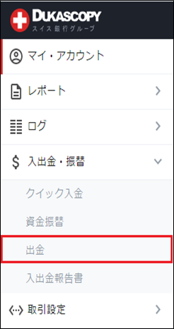 お客様マイページにログイン後、「入出金・振替」をクリックし、「出金」を選択します。