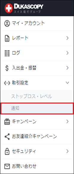 お客様マイページの「取引設定」より「通知」を選択します。