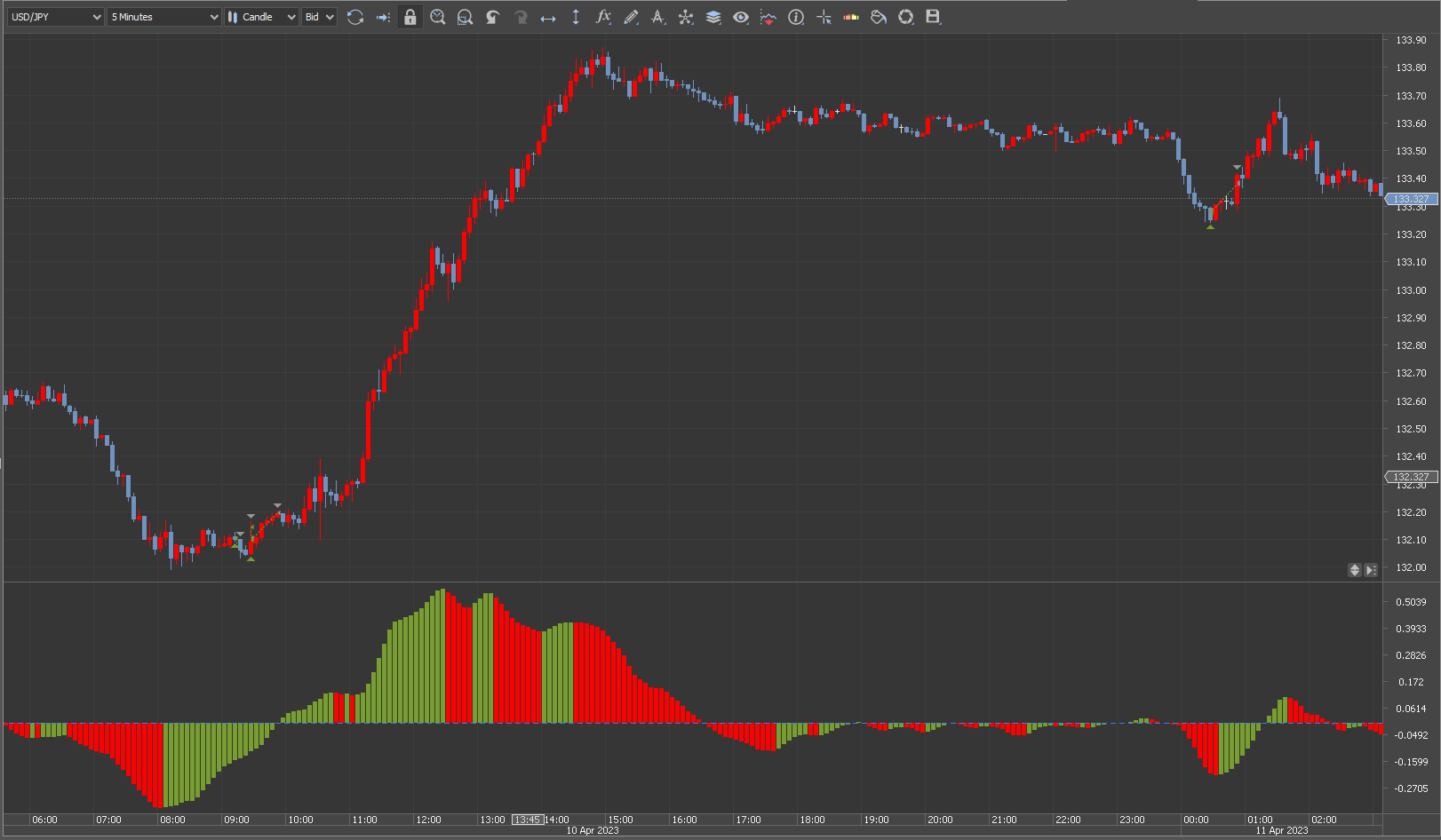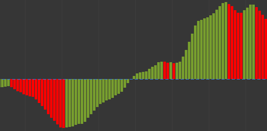 短期移動平均が長期移動平均よりも高い場合、ゼロライン上に表示される。