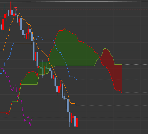 「転換線が基準線の上にあれば強気」「転換線が基準線の下にあれば弱気」とされています。転換線に沿って上昇しているのであれば転換線がサポートライン(押し目の限界)